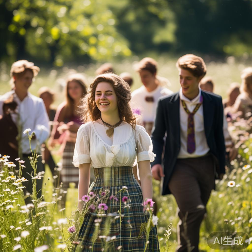 时不时,在草坪上年轻人们嬉戏打球,他们边走边聊,女孩们则一朵接一朵地摘下鲜花,插给身边的绅士。然而,这位来自苏格兰的小姐,却对子花草视而不见,似乎没有哪一朵能够入她的法眼。最后,她转向栅栏外,看到了盛开的蓟花,难免涌起一丝微笑,心中暗自欣喜起来,她指示少爷去为她摘一朵。