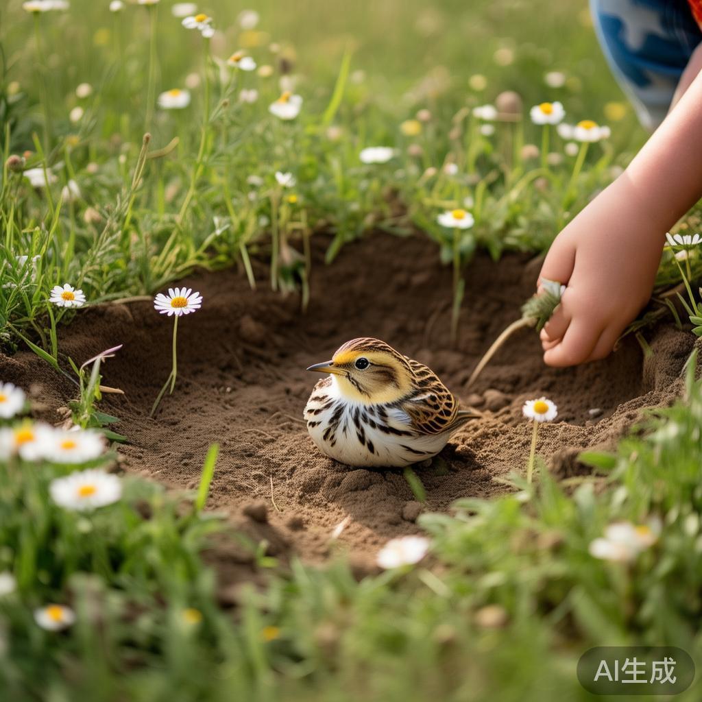 “我们可以在这儿挖块草皮,使百灵鸟稍显宽敞。”其中一个孩子说道。他开始在小雏菊的周围挖起一块方形草皮,让小雏菊正好留在中央。