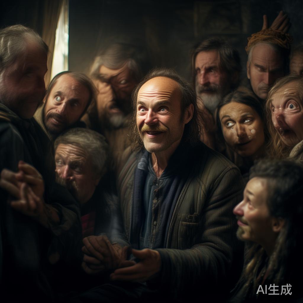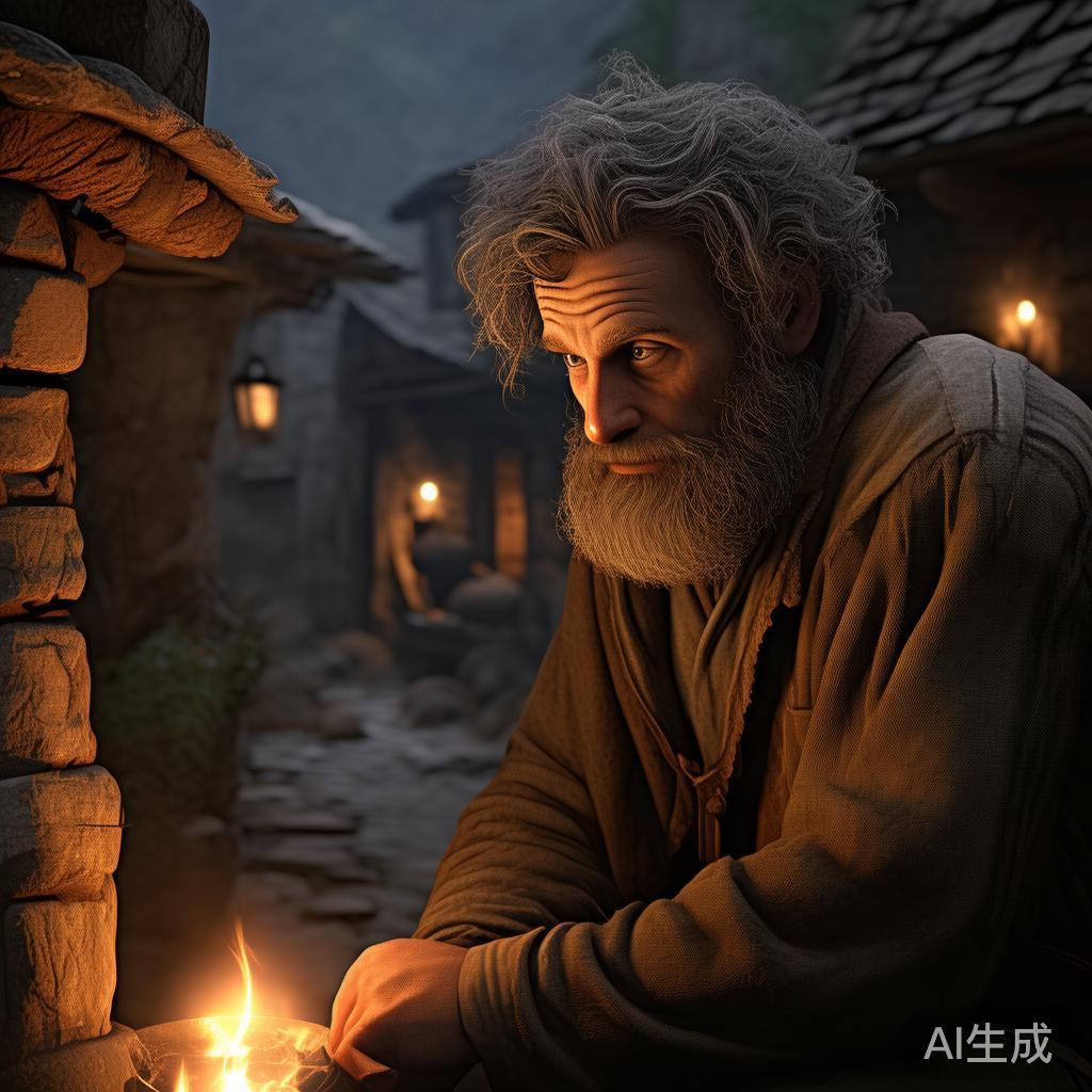 商人如蒙启迪,按她所言,夜晚偷偷潜往盲人的住所。在那儿,他隐秘地寻找合适的位置,静静地倾听他们的对话。果然不久,几个人陆续而至,互相寒暄过后便围在盲人周围。