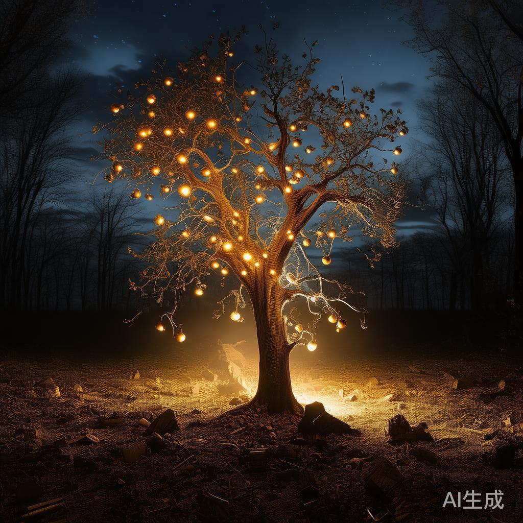 夜深人静时,遵循女巫的建议,两个内脏悄悄埋了起来。第二天,令人惊喜的事情发生了——一个闪亮的树木居然冒出了,美丽、金光灿烂的果子挂满枝头。