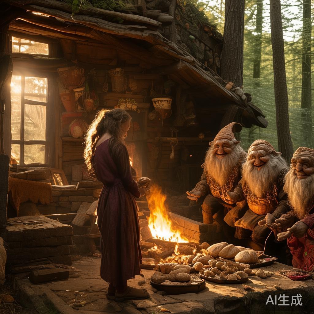 所以说,她来到小矮人的小屋,那儿暖洋洋的,像个避风港。真的很令人舒服,于是她把自己的面包分给了这三个小矮人。这小小的一份分享,让我心里升起一阵温暖。谁会想到,他们竟然出于感激,为她施下了魔法:从此以后,这姑娘一说话,便会吐出金子,简直就是漫步在大街上的富婆啊!